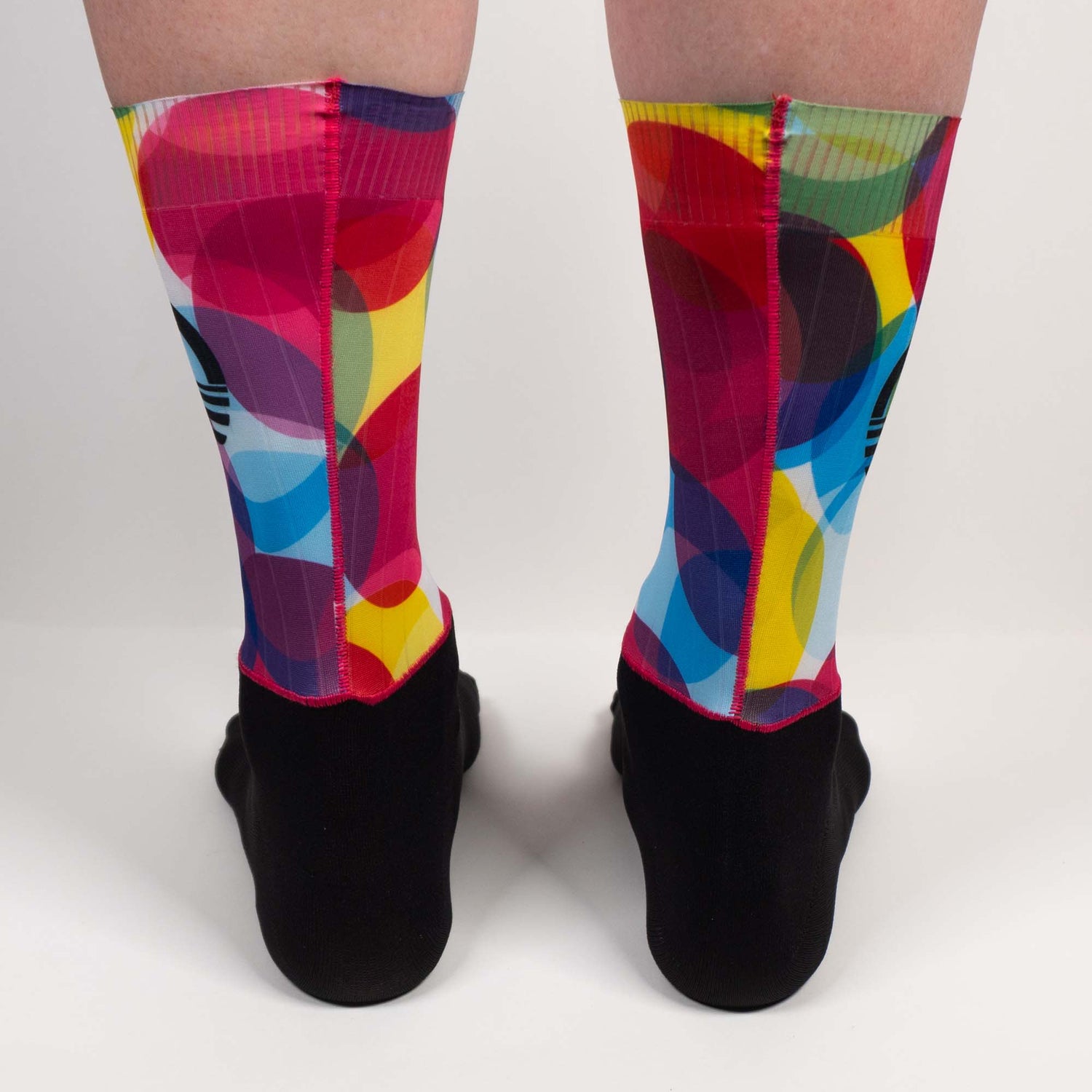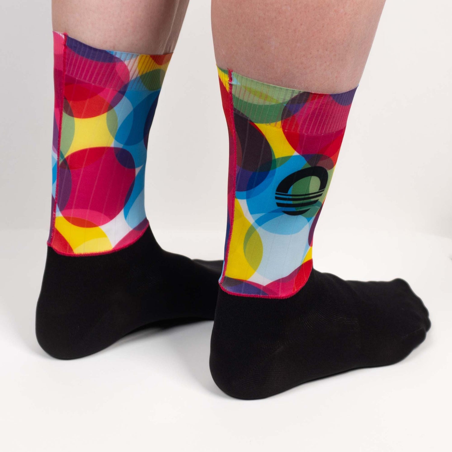 Aero socks are one of the most cost effective aero upgrades (and they look pro too). Unlike some others, ours do not feel stiff or bulky. These ones are also not a knit upper, but are instead a seamed solid fabric. The CMYK design keeps you bright and visible with its bold colourful process colours.