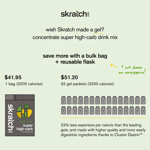 Super High-Carb Sport Drink Mix is designed to solve a prevalent problem for endurance athletes: fueling for big days of training or racing when preparing or carrying real food isn’t possible. Super High-Carb is powered by Cluster Dextrin™, a highly-complex carbohydrate that digests easily and steadily, like real food. One serving of Super High-Carb provides 400 calories of energy.