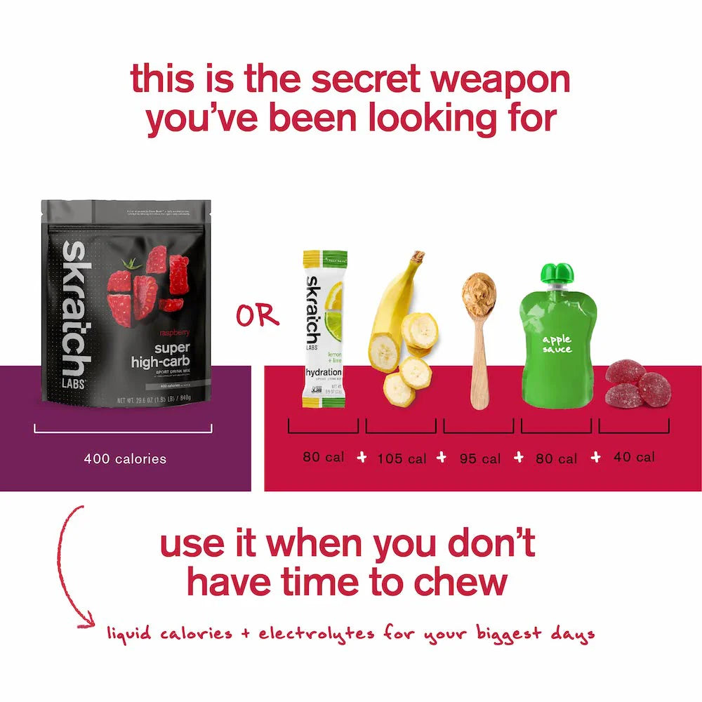 Super High-Carb Sport Drink Mix is designed to solve a prevalent problem for endurance athletes: fueling for big days of training or racing when preparing or carrying real food isn’t possible. Super High-Carb is powered by Cluster Dextrin™, a highly-complex carbohydrate that digests easily and steadily, like real food. One serving of Super High-Carb provides 400 calories of energy.
